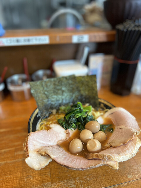 チャーシュー麺750円 あー、やってしまいました。今日の3杯目。 家系直系の末廣家。この頃、多い野菜やらトッピングが多い家系です。 今日はノーマルにチャーシュー麺の硬めのみオーダー。 出てきたラーメンはノリ3枚、チャーシュー4枚、ネギに多めのほうれん草。 スープは、豚骨醤油だがやや豚骨濃い感じでうまい!麺はお決まりの酒井製麺の丸みを帯びた中太麺少し短いのも酒井製麺〜 オススメのトッピングとかミ