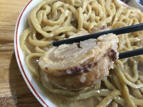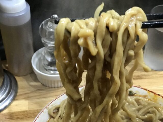 麺は極太平打ち系で、ほんのり硬めのもっちり系でゆで加減が絶妙。