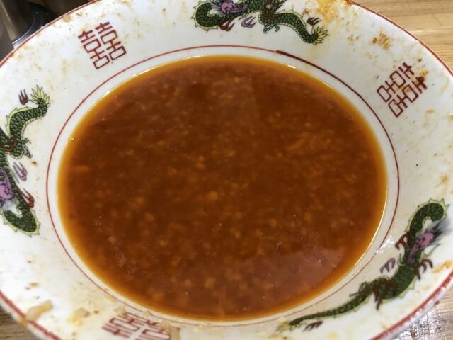 なるべく麺や具に絡めながら食べ進めた物の、丼の底にはやはりスープがのこるわけで。
