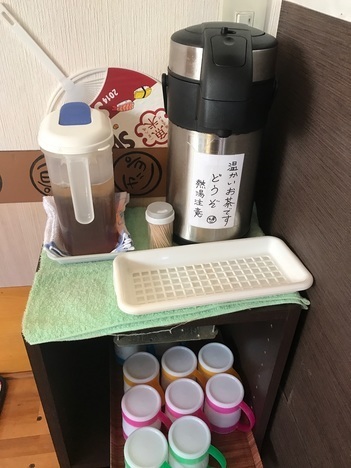 セルフで冷たいのと温かいお茶も用意してくれてあります。