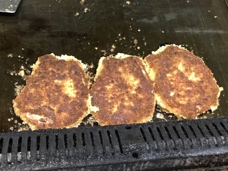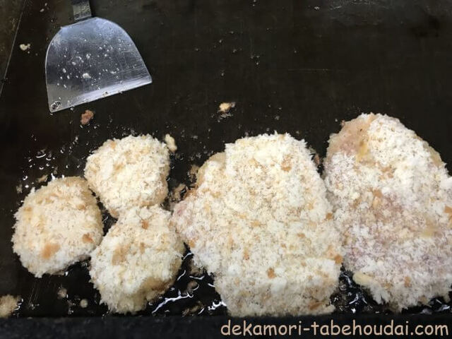 パン粉から挽いて、揚げずに両面を焼いて行きます。