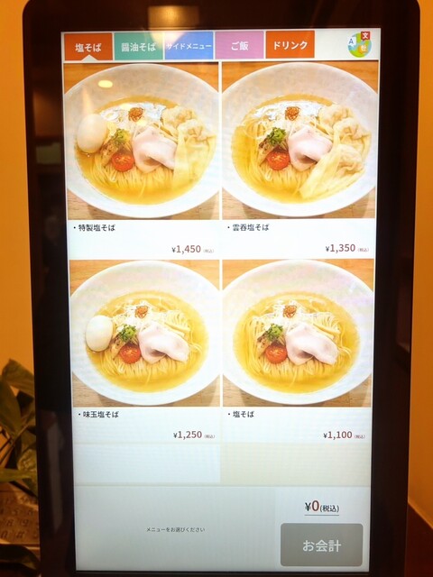 塩そばと醤油そばとがあり、トッピングは雲呑、味玉、全部載せの特製の3種。折角なので「特製塩そば」(¥1,450税込)を注文。