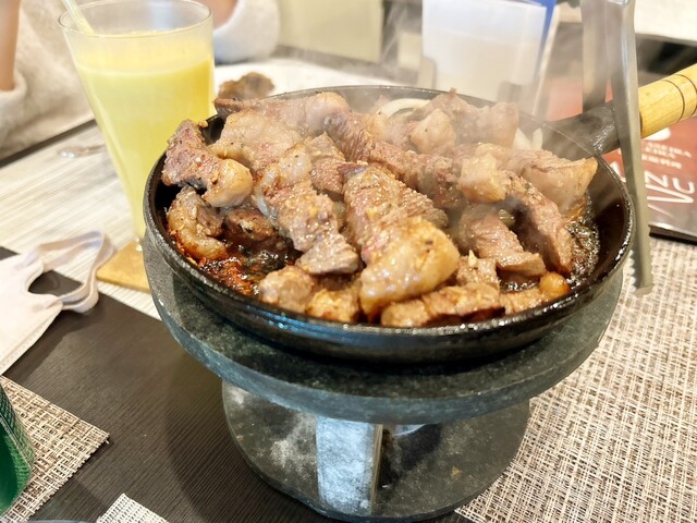 ここで予告のあった「特別なお肉」が鉄板でジュージューいいながらやってきて卓上コンロに置かれます。単品メニューにある「イチボとタマネギの鉄板焼き」でした。