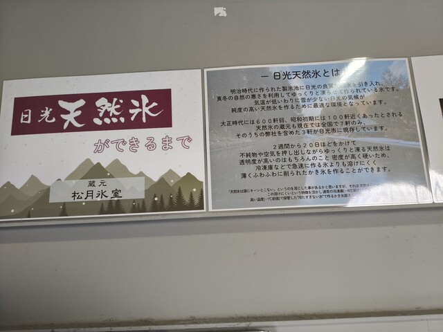店内には、天然氷ができるまでの工程が丁寧に展示されており、池の準備から切り出しまで、すべて手作業で行われる伝統の重みを感じられます。