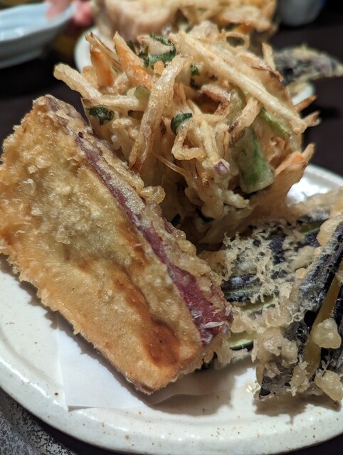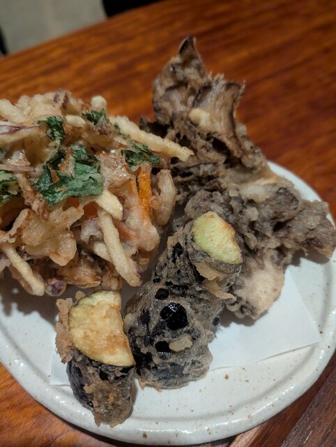 かき揚げ、舞茸、茄子の天ぷらをいただきました。
