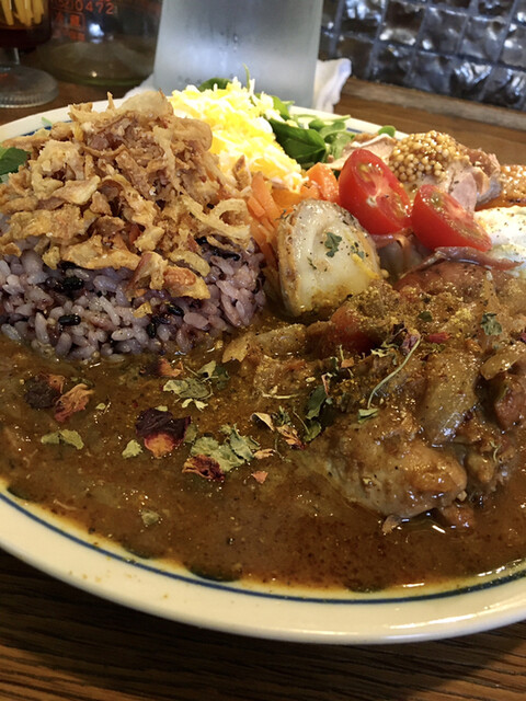 骨付き鶏ももと自家製梅酒梅の実のチキンビンダルーカレー
