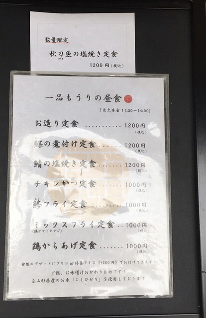 秋刀魚定食は既に売り切れ。前回もそうだったので人気がある。自分は鯵フライ、女房殿はお造り定食を所望する。