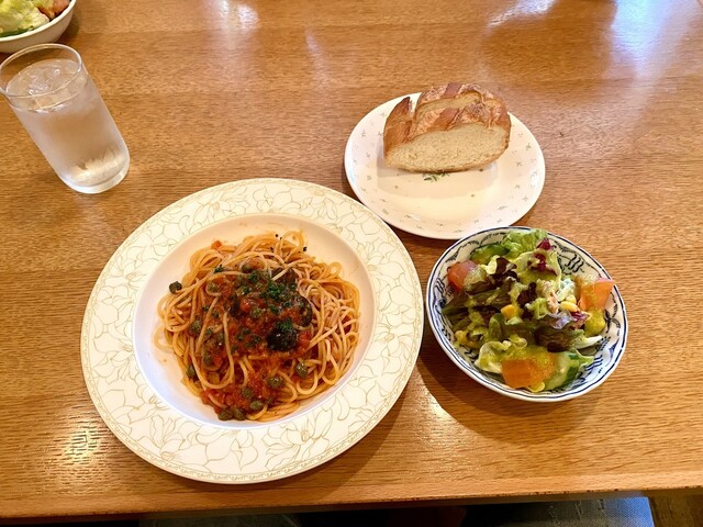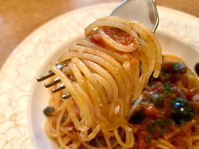 トマトベースに #オリーブ #ケーパ #アンチョビ を使った #スパゲッティ