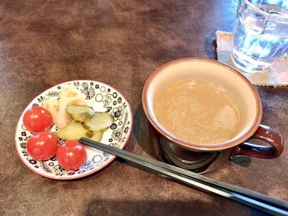 食事を注文したらセルフでスープ&ピクルスを頂けます!