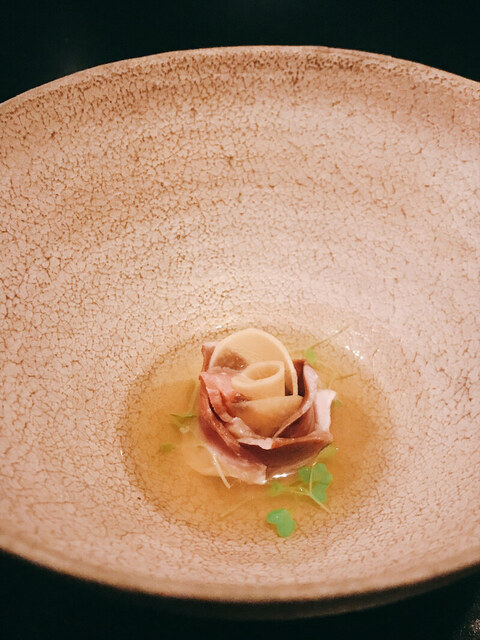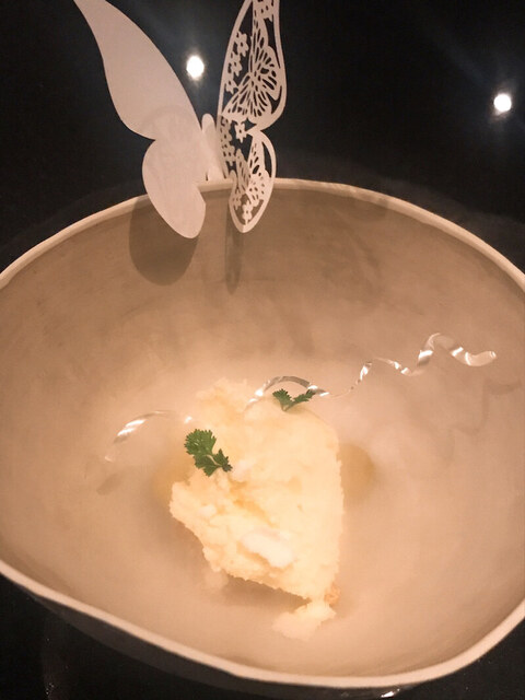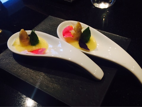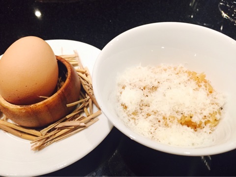 以前は半熟のゆで卵に、注射器でトリュフオイルと空気を注入し、各自スプーンで割ると、「ポン!」という音と共に、レストラン内にトリュフの香りが充満しておりましたが、今回は、茹で卵→温泉卵になっていました。でも、注射器でトリュフオイルを注入する技は健在でした。