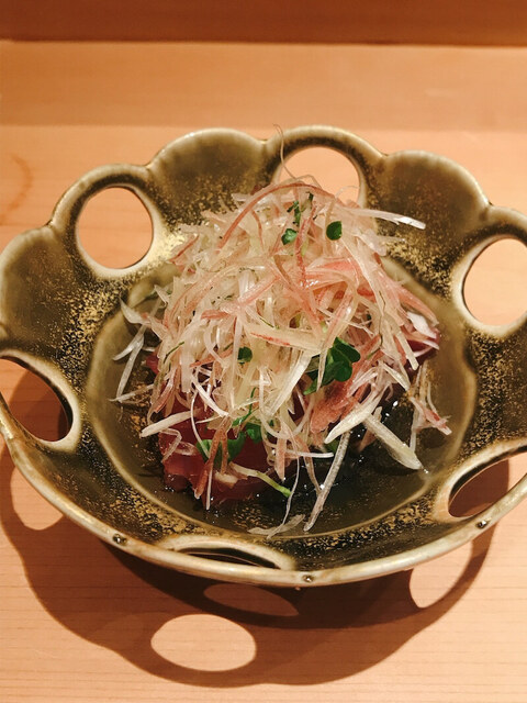 漬けメジマグロと香味野菜。