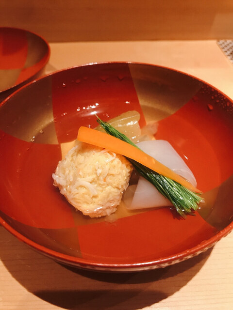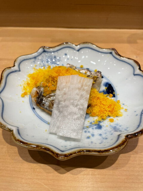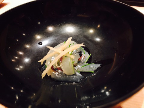 この後、白身の刺身が来る。見た目(盛り付け)があまり美しくなかったので写真は撮らなかったけど、美味しいは美味しかった。雲丹、コブ巻き、芽葱。次の秋刀魚の一皿は素晴らしかった!!なんと野菜との付け合わせ。そして秋刀魚が美しい。肝ソース、豆板醤、辛子、ワサビなども添えてあり、お好みで。私はやっぱり肝ソースが美味しいと感じましたが、秋刀魚を「辛子」や「豆板醤」で、という発想がなかったので、これは驚き感動した。