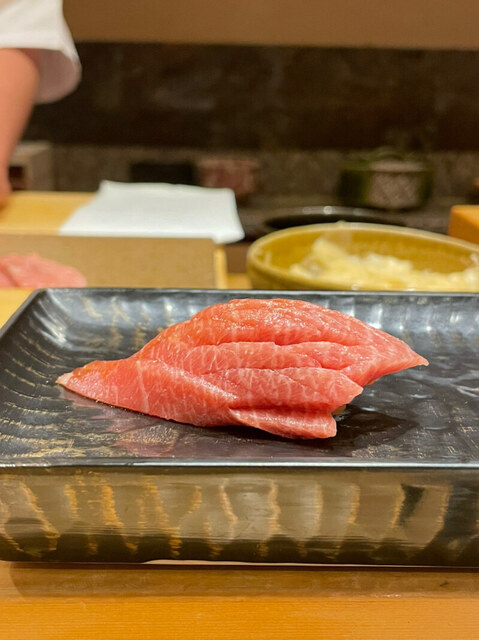 銀座8丁目のとかみさん。赤酢のきいた、なんともアレンジメントなシャリが有名で、いっきにお客の舌をとりこにしたお店です。シャリ以外に人気なのは「マグロ」。これは歴史ある築地のマグロが手に入る事でも有名なこちらのお店からしたら、一番の強みといっても良いでしょうね。カウンターに座る。同時にビールをお願いします。ビールが到着したころを見計らって、親方がご挨拶してくれる。苦手な食材などをお伺いしてくださり、いざ、とかみのディナーがスタート。手始めの1品目は、脂がたっぷりのったマグロの巻物。つまりトロ鉄火手巻きが親方から手渡される。