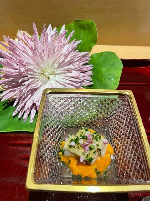 一品目は、蒸し寿司の上には雲丹の案と揚げ海老と浜ぼうふう。