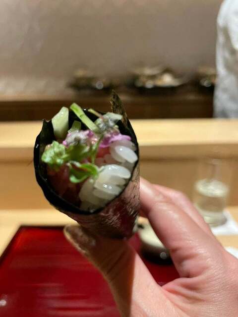 鮪とべったらの手巻きは前回から極細♪いい感じ。