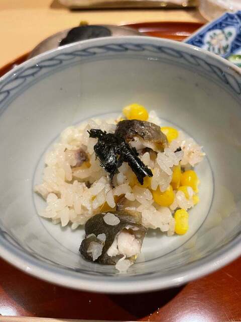 〆は鮎ともろこしのご飯.ひと口だけ頂く事にしました。