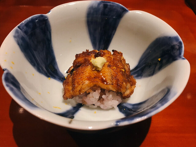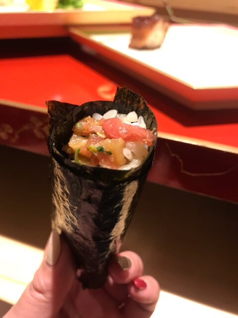 お初にお目にかかる器には、、、赤酢のシャリと上に乗った何かのお楽しみが♡