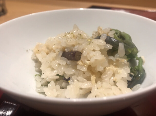 〆は新生姜の御飯。ますはそのまま。2杯目はフカヒレ餡をかけて。