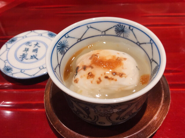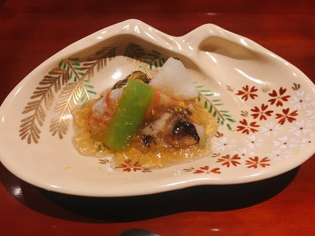 海老と雲丹、玉子豆腐にジュンサイとジュレを合わせた先付。