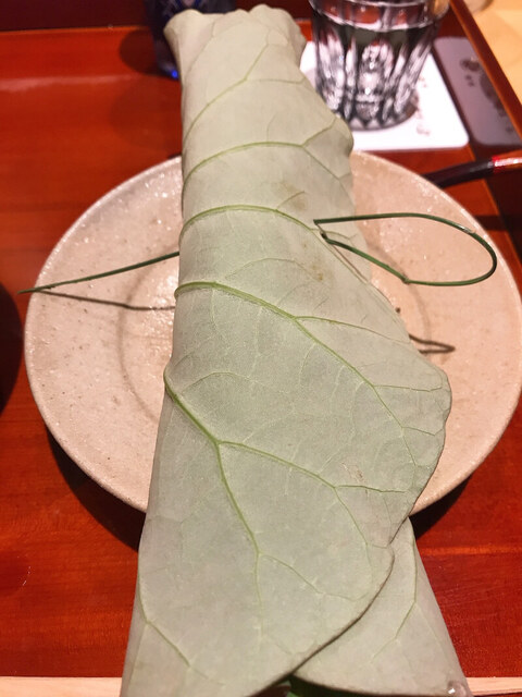 蓮の葉に包まれていたのは、、、なんと鮑の肝御飯の上に山葵!!