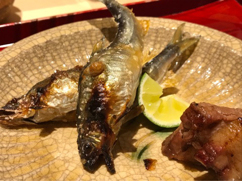 炭火で焼きたての鮎。ホワホワ。ここのタデ酢が美味しいのです♪牛蒡を鰻で巻いたのも定番に(‾▽‾)