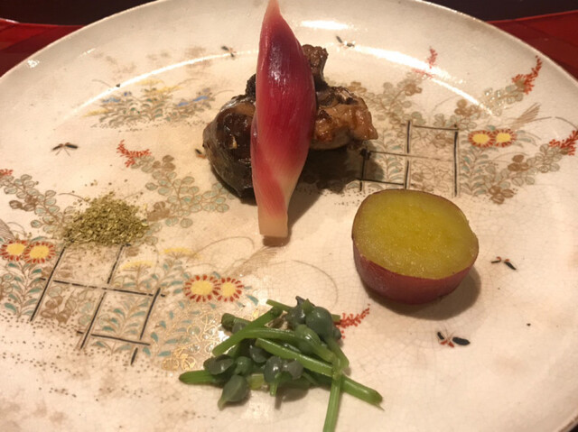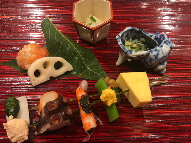 小袖鮨、ジュンサイトマト、玉子しんじょう、モロコシ揚げ、鴨ロース、蚕豆、原木椎茸、タコ、ホオズキの中身は山桃