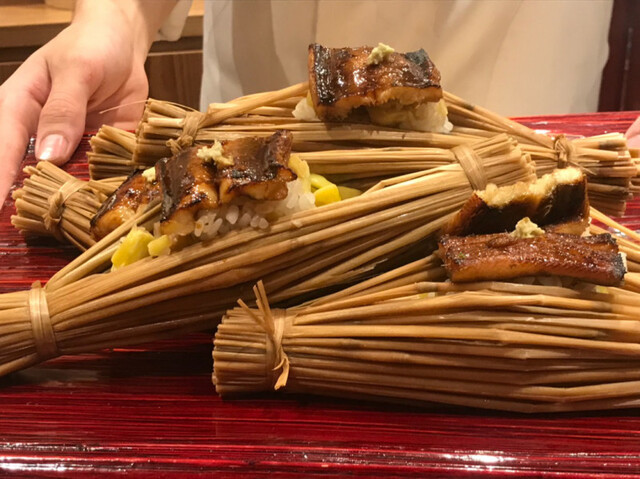 郡上八幡の鮎、鰻の八幡巻き(ゴボウ)