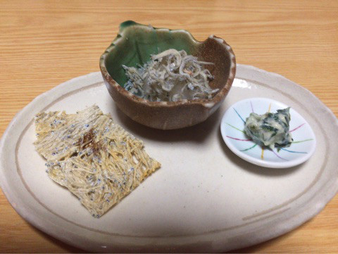 大きなテーブルに座布団が4つ。先付けはタタミイワシ、ジャコおろし、ワサビ漬け。