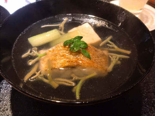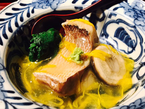 鯛潮椀(鯛真丈、ワカメ、フキ、桜麩、新芽)