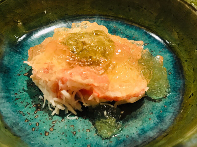 ズワイ蟹、蟹みそ、三杯酢のジュレ