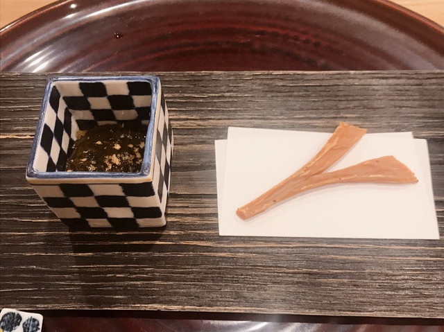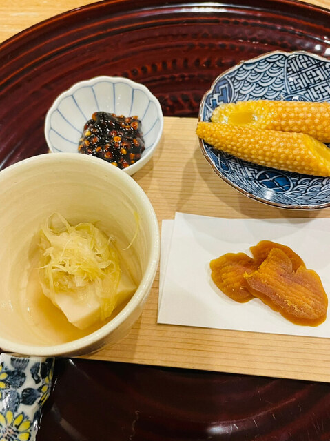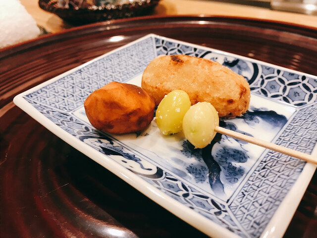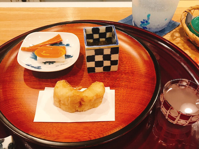 ・銀杏 茶わん蒸し・ゴマ豆腐干し柿乗せ、からすみ餅、堀川牛蒡揚げ