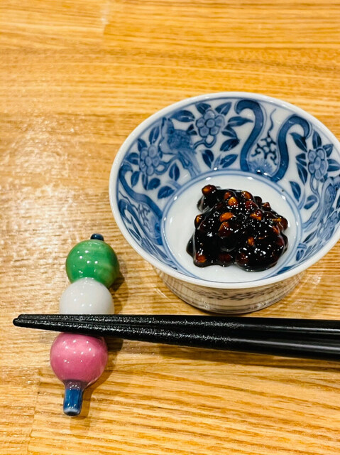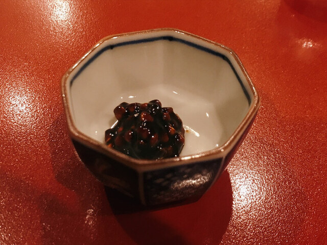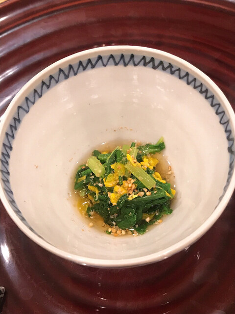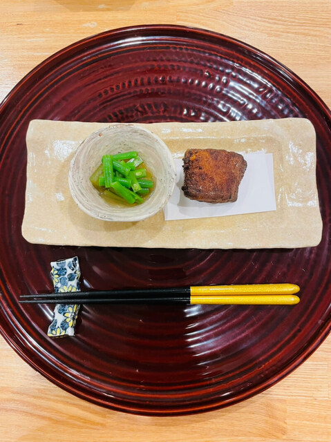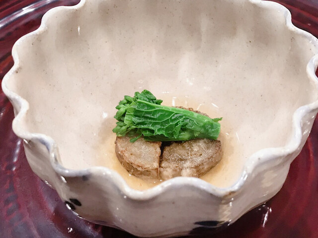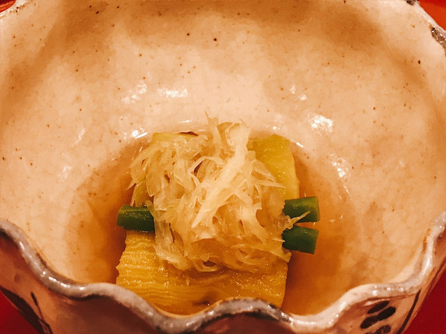 さてお料理のスタートは芋茎。小さくて細いのに存在感があるんですよね。出汁をたっぷりと含んでいて噛むと幸せに。