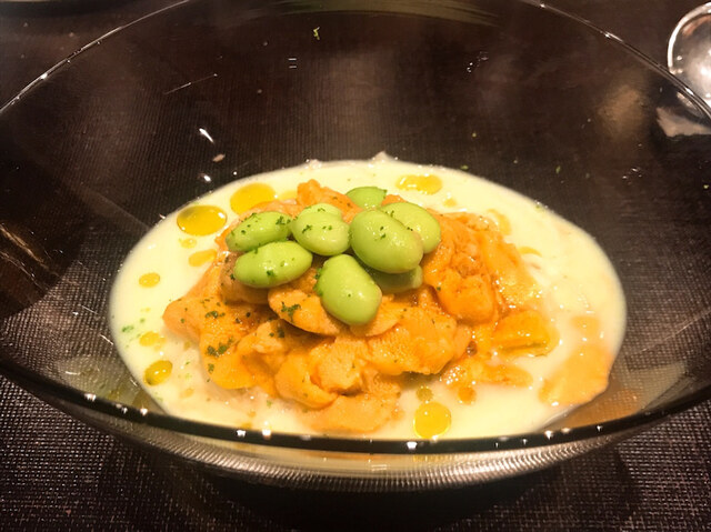 甘鯛にエクストラバージンオリーブオイルがかけられて、上には雲丹がトッピング。。。量がおかしいけどね。