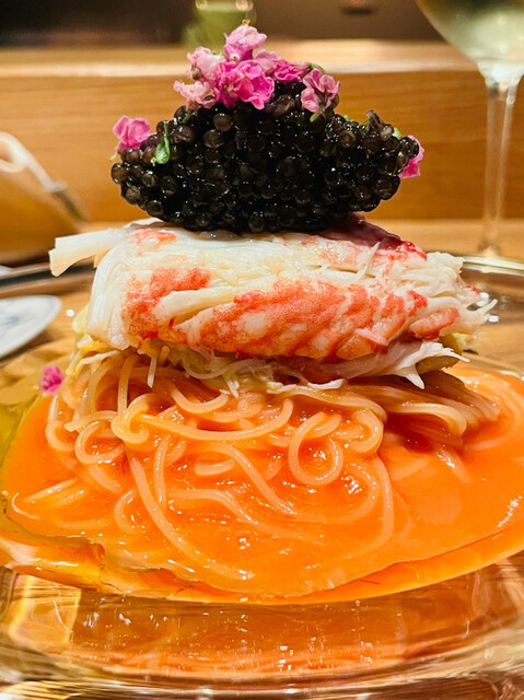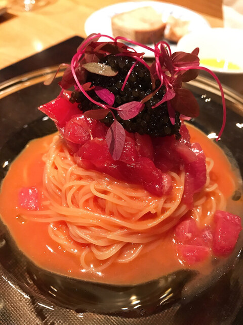 ・ フルーツトマトのカッペリーニ 境港の赤身と中トロ キャビア アマランサス