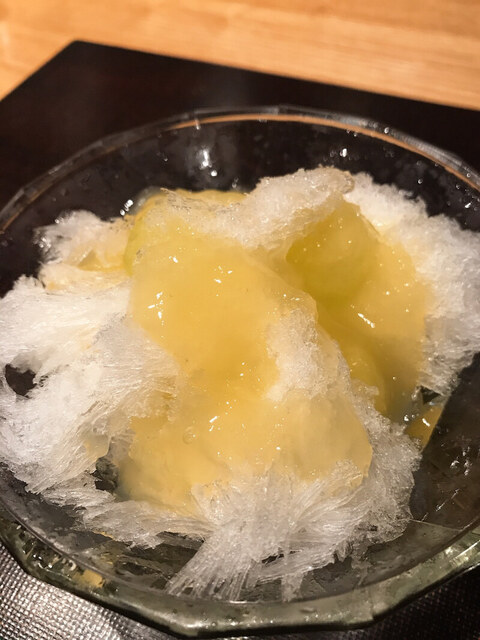 目の前で削ってくれたコナツのかき氷。舌にはパンナコッタ入り。