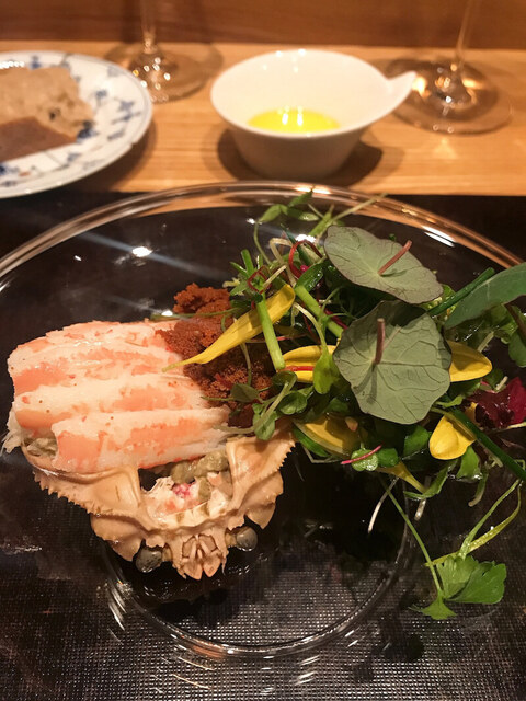 ●松葉蟹、リンゴ、カリフラワーペーストのグラタン風、黒トリュフ