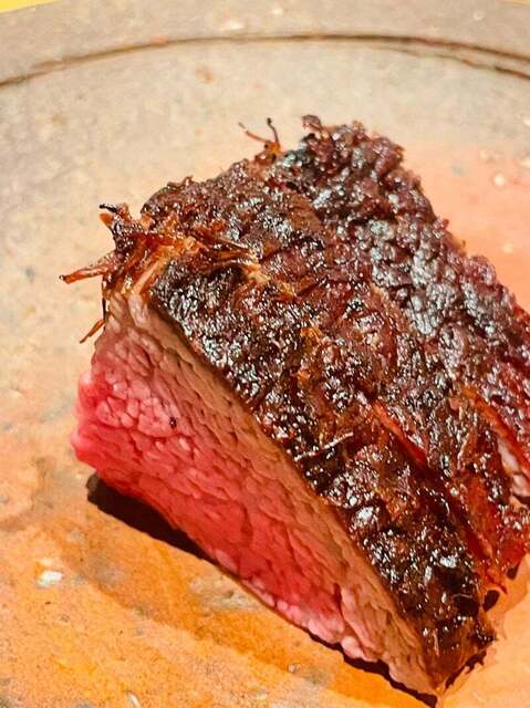 6皿目…和牛ヒレ肉は炭火で何時間もかけてしっとりと焼き上げています。たまり醤油と擦りたて山葵で。