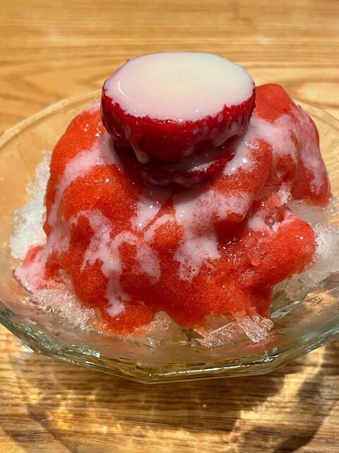 キャラメルパンナコッタ入りのかき氷は、イチゴ。