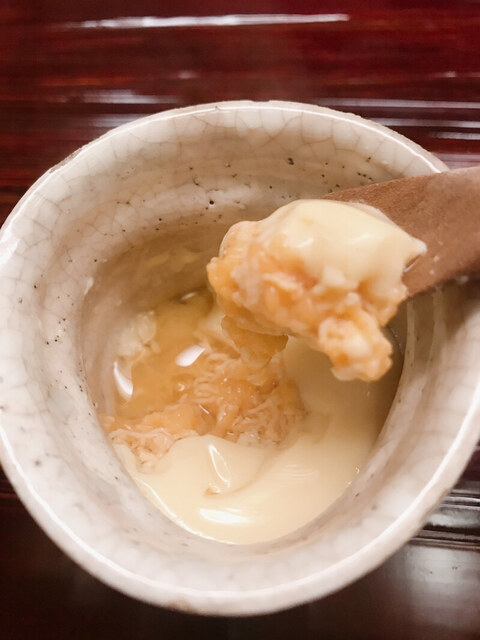 熱々の白子とお粥が一体化。たまらず日本酒を飲みたくなる。。。酒器もとてもかわいらしい。