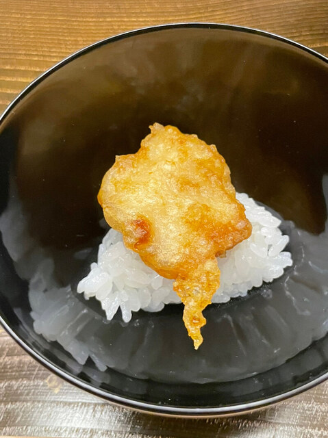 ・白海老のあられ揚げ、能登アスパラの天ぷら