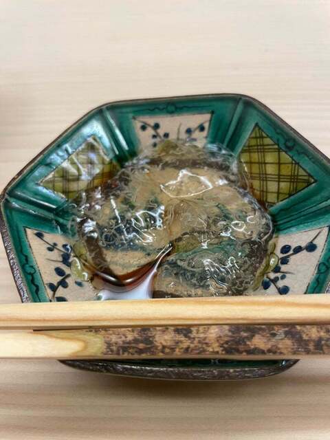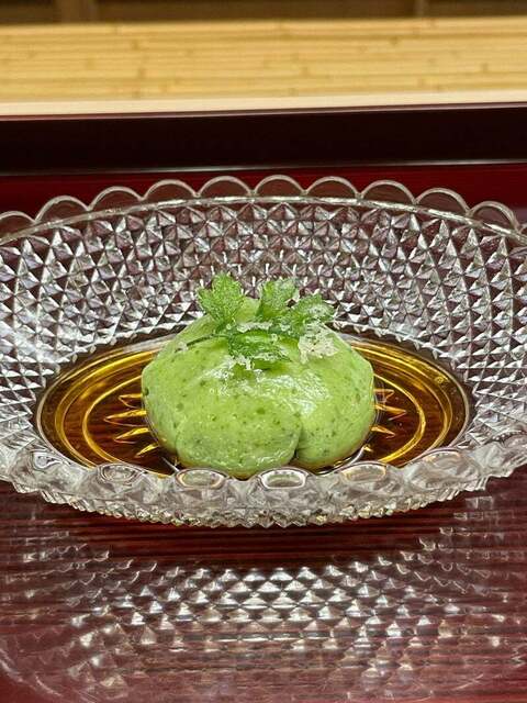 朝から取ってきたという山菜のうち、新ヨモギを使った葛豆腐。苦みはほとんどなく、芳醇な香りとお出汁のコラボが素晴らしくくちどけも良い。