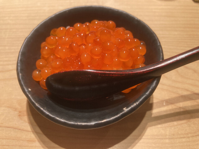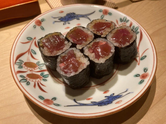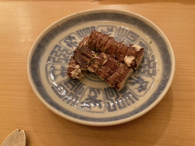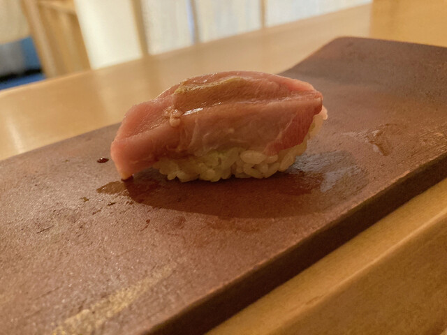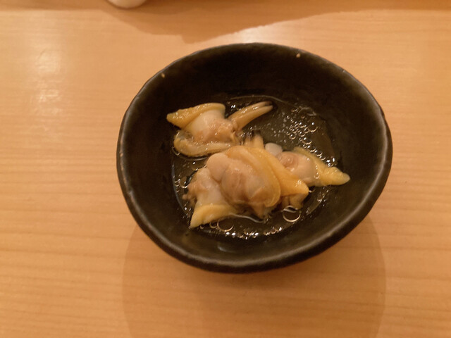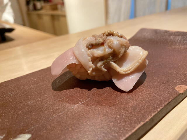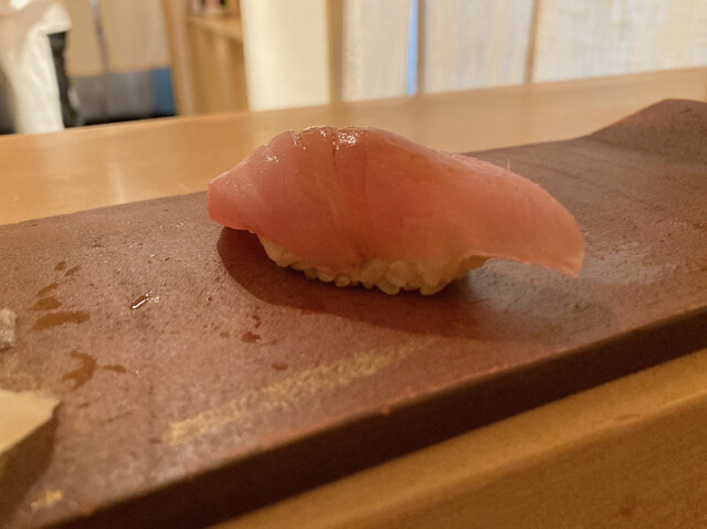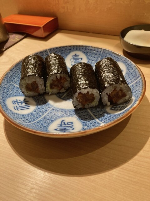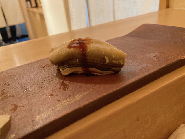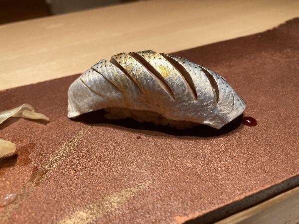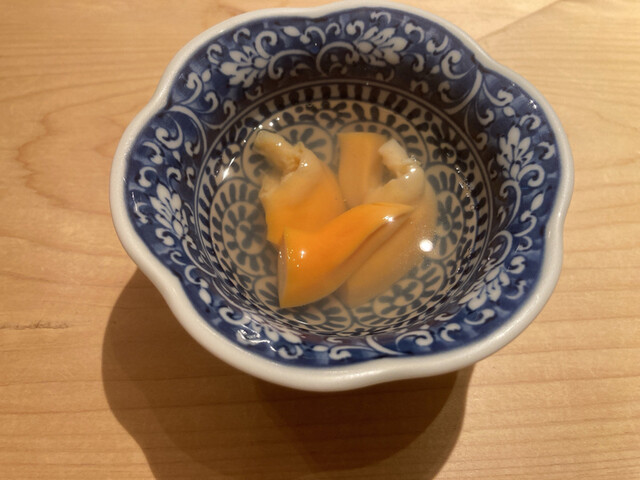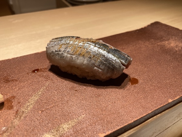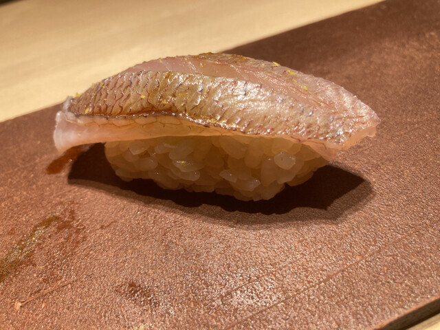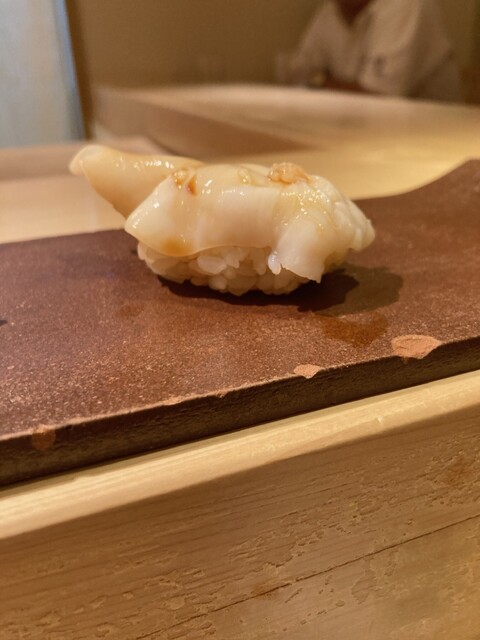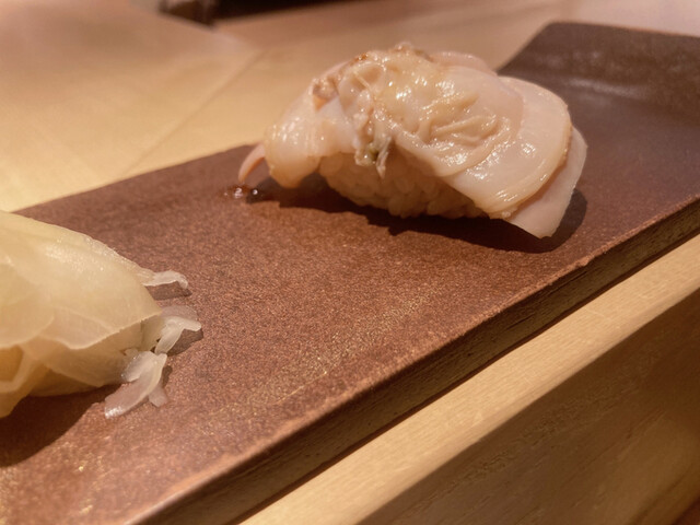 握りについては、シャリの完成度が相変わらず高いのですよ。そして、ネタの特徴に合わせて切り付けを調整して握りの硬さ自体を変えていらっしゃるみたいなんですけど、口の中に入って咀嚼しているうちにハラリと解けるんです。でもって、香りが鼻の奥に上がってくるのですよ。中トロは程々な脂感と上品な香りの余韻がよかったですし、帆立はおそらく煮切りをつけてサッと炙ってあったんだと思うのですが、帆立の甘味と香ばしさの余韻がよかったです。でも、ほかのネタもそれぞれ旨味や香りの余韻の塩梅が良くて、どのネタが飛び抜けて良かったというよりは総じてレベルが高くて隙がない感じです。でも、今回1番驚いたのは鯵でございます。いつもはあたりネギをかまして香りを引き出す感じだったのですが、今回は塩締めした後に酢洗いして旨味を引き出す感じが良かったです。