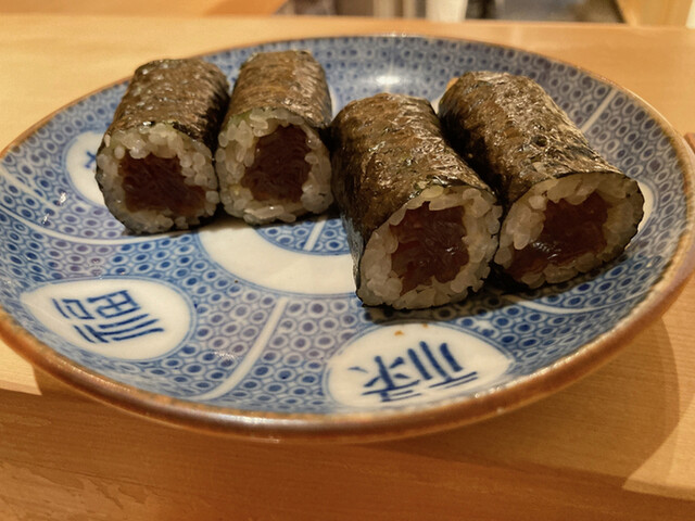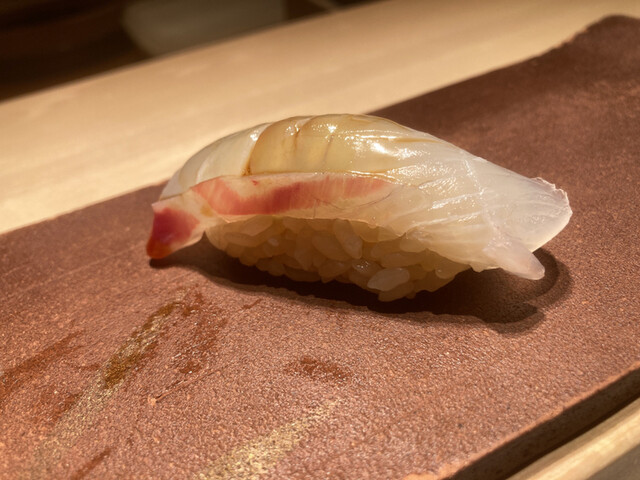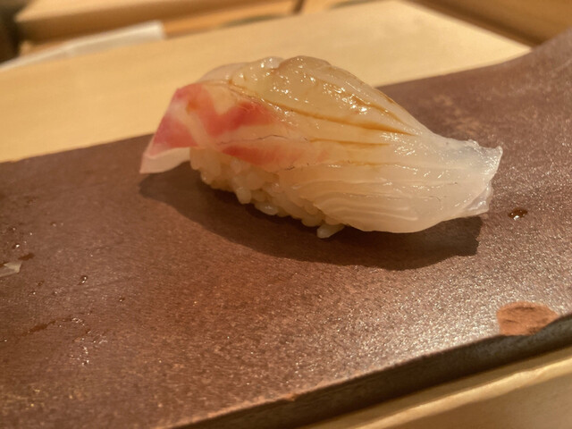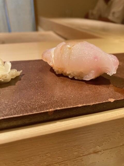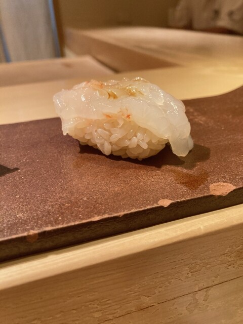 握りに関しては、大トロで始まり、あい澤さんでは珍しく雲丹で終わるという構成でございました。大トロは冬のそれと比べて脂感が控えめでしたが、アタシには丁度良かったです。メジマグロって真冬じゃないけどもうすぐ春にって言う時期に出てくるイメージでしたが、佐渡の大きめのメジ(20キロ弱)をやま幸さんから頂いたそうでして、これも美味しかったですよ。そしてあい澤さんといえば白身!今回は金目鯛、鯛(真鯛?)、甘鯛の3貫出てきましたけど、白身=淡白というイメージを良い意味で覆して下さいます。全体的に隙がなく、どれも高レベルなんですが、シャリがメッチャ美味しいんですよね。硬めに炊かれて程よく酸が効いている感じがいいんです。そして、ネタによって握りの強弱が微妙についていたりしている様にお見受けしましたが、間違えていたらごめんなさい。
