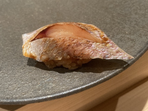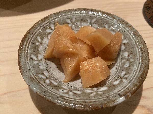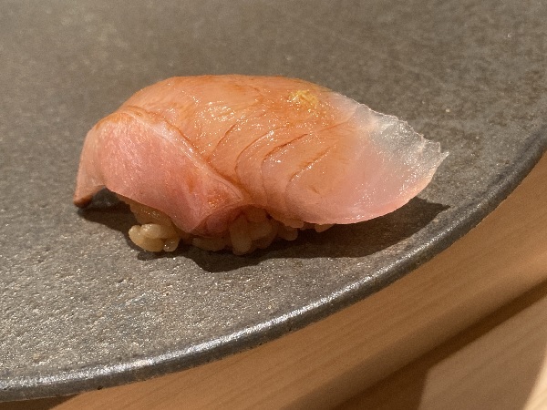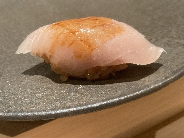 金目鯛は、銚子周辺のモノを使っているお店が多いので、何故静岡なのかを聞いてみました。その際、銚子周辺のモノを使っているお店は静岡近辺のモノより水深が深い銚子付近のモノの方が水分量が少ないのがいいと言っていた事も大将に伝えたのですが、白山大将は「産地より誰が獲ったかの方が重要なんです。」と仰ってました。要は、獲った後の扱い方(締め方とか)の方を大将は重視しているとの事。ナルホド!とても参考になるお話を聞かせて頂きました(*´▽`*)