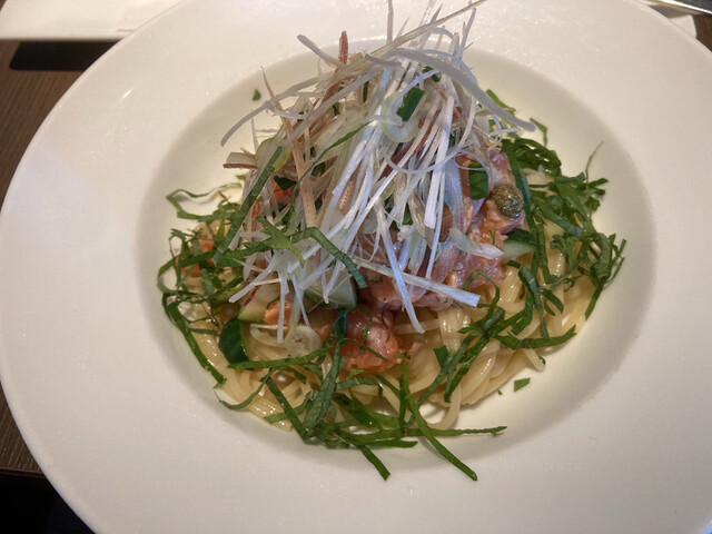 サラダのシャキシャキ感とドレッシングの程よい酸味で食欲が増し、パンの軽やかな食感と安定の美味さに感動しているところで冷製パスタが!ミョウガや大葉の香り、胡瓜やとびこの食感、帆立の甘味、そしてベースとなっているレモンの酸味が喧嘩せずまとまっていてマジでやばかったです。パスタ2皿目のボロネーゼも、コッテリ過ぎず、でもひき肉やトマトソースの旨味が程よく感じられてこれもマジでやばかったですね。