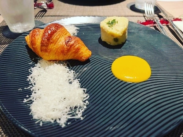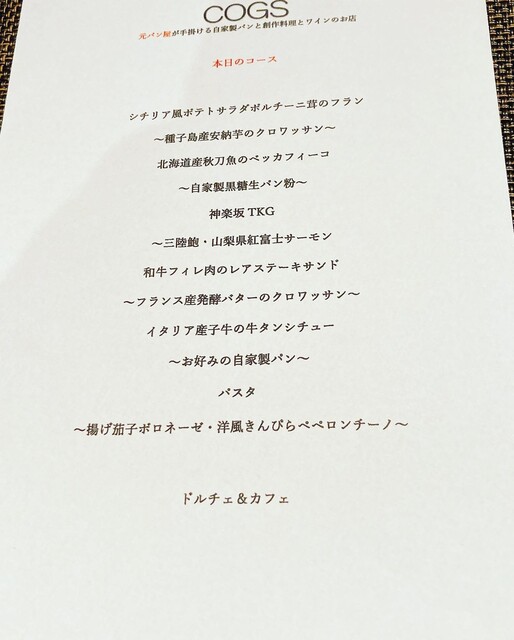 コグスさんを知るきっかけとなったのは、7月に六本木の鮨由うさんに伺った際に頂いたクロワッサンのお土産でした。コグスさんと鮨由うさんがコラボしたのがきっかけで、期間限定で鮨由うさんでコグスさんのクロワッサンがお土産として配られていたんですよ。おうち帰ってから食べたんですけどこれが超絶美味いときたもんだ!そしてその後、YOUTUBEでコラボイベントの動画が上がってるのを拝見し、ぜひ行きたいとなったのです。オンラインで予約を入れたのは2週間くらい前。予約した翌日に、セットメニューかコースどちらがいいかと連絡があったのですが、せっかくなのでコースにしました。ランチのコースはディナーのコースをコンパクトにしたものとこのことだったし、そんなに高くなかったので。