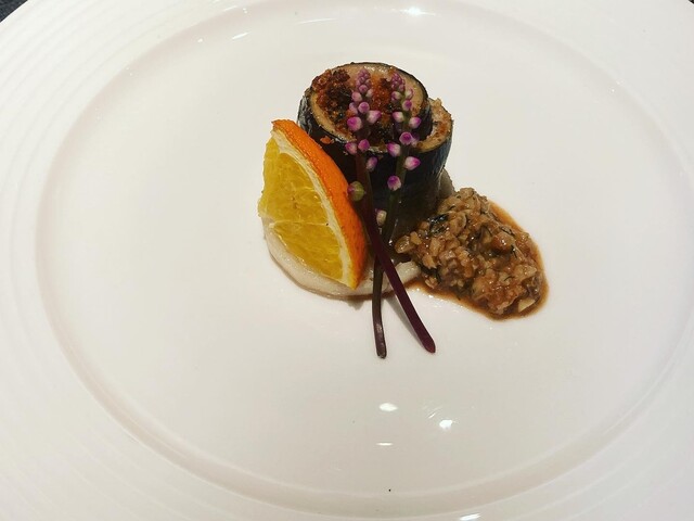→手巻き寿司とは言ってなかったけど、鮨loverな人なら凄く響く逸品だと思いました。海苔の香り、シャリに見立てたチーズリゾットのおこげと叩いた梅の洋風ペーストの風味、車海老の旨味(甘味)が渾然一体となって思わず奇声を上げそうになりました汗