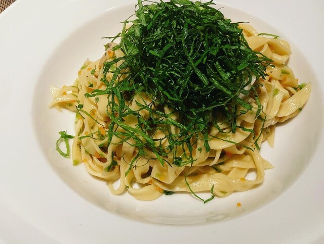 ●自家製手打ちパスタ(つぶ貝、とびっこ、大葉のペペロンチーノ)160g