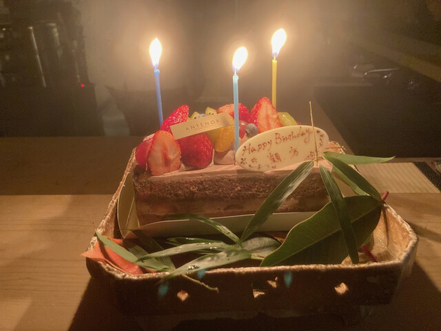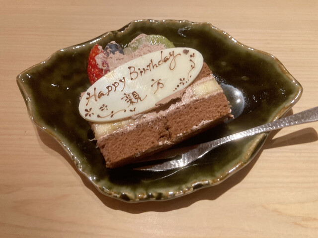 デザートの果物を食べながら余韻に浸っていたら、サプライズが。アタシ、12/13が誕生日なのですが、そのお祝いをして頂きました♪1日早いお祝いでしたが、こんな風に祝って頂いたことが無かったのでビックリを通り越してぽかーんとしてしまいました(汗)リアクションが薄くて申し訳ありませんでした尾崎大将。でもメッチャ嬉しかったです。アタシみたいにメッチャ背伸びしてもたまにしかお店に行けない客でも凄く大事にしてくれる尾崎大将マジで優しすぎる!本当は泣きそうだったんですけど我慢してたんです。尾崎大将、大好きです!壺買いますwこれからも仲良くして下さい!