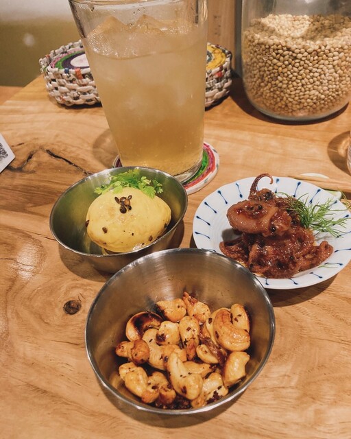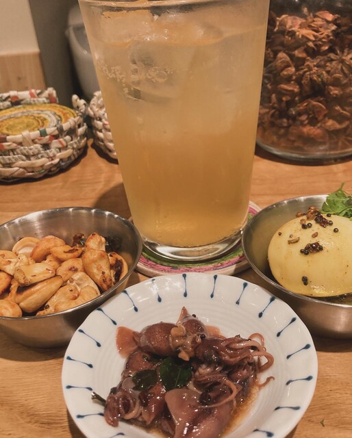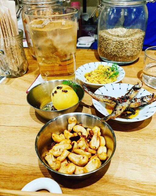 カウンターの1番奥の席に陣取り、まずは恒例のスパイスのみごっこ。スパイスソーダを片手に、スパイス玉子やナッツのテルダーラ、日替わりアチャール、イワシのスパイス焼き、シンハラアチャールをつまみながら、居酒屋風に過ごすこの時間がたまらなく好きです。スパイスの香りが鼻を抜け、ソーダの爽快感が身体に沁み渡ると、心が自然と解きほぐされていきます。何も考えず、ただ好きなものに囲まれて過ごすこのひとときは、まさに至福の時間です。  そして、一週間を無事に終える事ができたのを実感します。そして、店主・マリコさんと他愛の無い話をするこのひと時がやっぱり最高なんだよなって思うわけですよ。